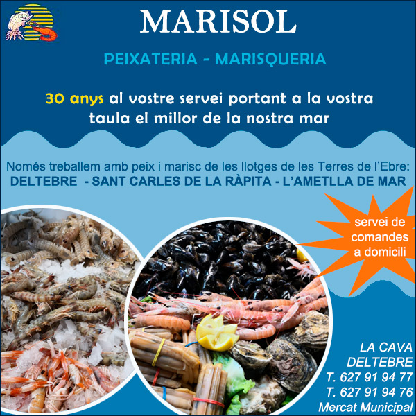 Deltebre Peixateria Marisol; per començar, dir que portem més de 30 anys portant a la vostra taula el millor del nostre mar. Som una peixateria situada al Mercat de la Cava de Deltebre. Així mateix, cada dia ens proveïm de peix i marisc, per tal de donar als nostres clients la millor qualitat al millor preu. A més, només treballem amb les llotges de les Terres de l’Ebre; (Deltebre, Sant Carles de la Ràpita i l’Ametlla d Mar). D’aquesta manera, afavorim el nostre entorn i la qualitat dels nostres productes. També, cal dir que tenim servei de comandes a domicili.